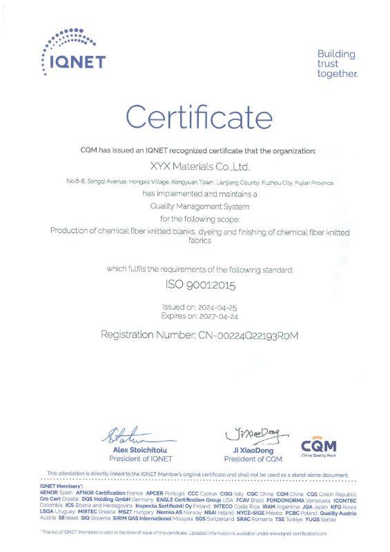 XYX Materials adheres to international environmental and quality standards, including Oeko-Tex, GRS, and ZDHC, ensuring safety, sustainability, and global compliance. We continuously explore new material technologies inspired by nature to enhance comfort, mobility, and well-being.