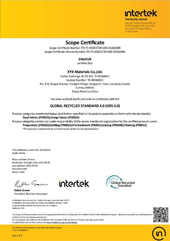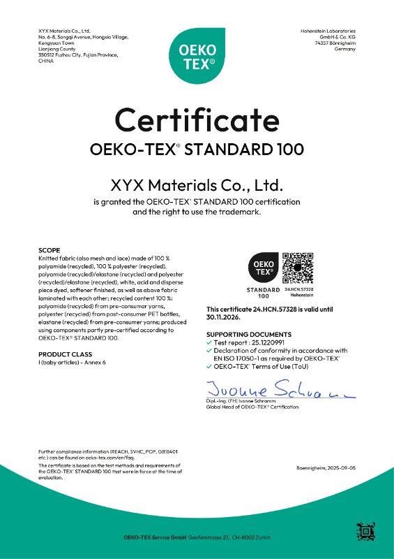 XYX Materials adheres to international environmental and quality standards, including Oeko-Tex, GRS, and ZDHC, ensuring safety, sustainability, and global compliance. We continuously explore new material technologies inspired by nature to enhance comfort, mobility, and well-being.