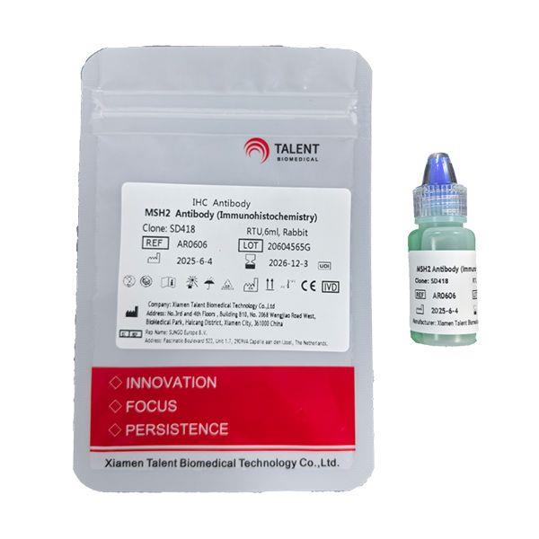 MutS Homolog 2 (MSH2) is a protein involved in the mismatch-repair pathway. This protein is commonly associated with hereditary non-polyposis colorectal cancer, and mutations in this gene are correlated with the development of sporadic colorectal carcinoma. Expression levels of MSH2 are abnormally low in a high percentage of patients with microsatellite instability, as well as endometrial and ovarian cancers. Use of Anti-MSH2 is optimized when paired in an IHC panel with antibodies against MSH6, MLH1, and PMS2. Reports have shown Anti-MSH2 to be useful in the detection of the protein in a number of normal and neoplastic tissues, and for identifying a loss of MSH2 in tumours that are microsatellite-unstable. Add the primary antibody to bind the antigen on tissue sections, and then use HRP labeled secondary antibody binding primary antibody to form the secondary antibody-primary antibody-antigen complex. When DAB chromogenic solution is added, HRP reacts with enzyme substrate to produce brown insoluble reaction product, which indirectly indicating the existence of antigen.